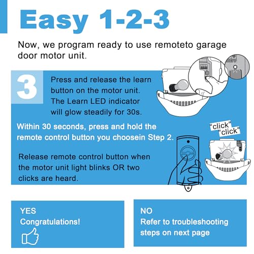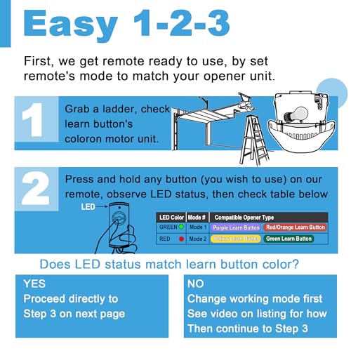 - PLEASE NOTE BEFORE PURCHASING: Easy Programming Direct Pairing with Opener The default mode of the Garage Door Opener fob is Green LED light for Red/Orange Purple Learn Button Door Opener, you will need to change the mode of the remote control if you are using a Green/Yellow Learn Button Garage Door Opener (See video or manual on how to change the mode)