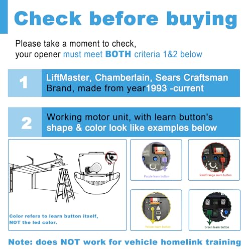 - Key chain Garage Door Opener Remote – Compatible with Chamberlain Lift Master and Craftsman Garage Door Openers Make sure your garage door opener has red/orange/purple/yellow learn button. This Garage Door Remotes works with openers manufactured from 1993 to the present and supports safety scroll codes. It is ideal for multi-vehicle households and provides a hassle-free solution as a replacement for lost or damaged remotes.