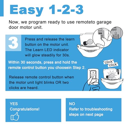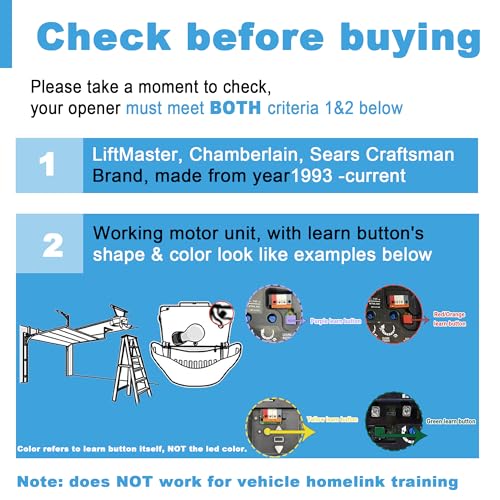 - Universal Garage Door Opener Remote – Compatible with Chamberlain Lift Master, and Craftsman garage door opener Please make sure your garage door opener has a Red/Orange/Purple/Yellow learn button.manufactured from 1993 to the present, this remote supports security rolling codes. Ideal for multi-car families or as a replacement for lost or damaged remotes, it offers a hassle-free solution