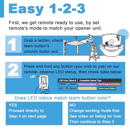 - PLEASE NOTE BEFORE PURCHASING: The default mode of the Garage Door Opener fob is Green LED light for Red/Orange Purple Learn Button Door Opener, you will need to change the mode of the remote control if you are using a Green/Yellow Learn Button Garage Door Opener (See video or manual on how to change the mode)