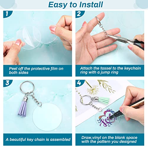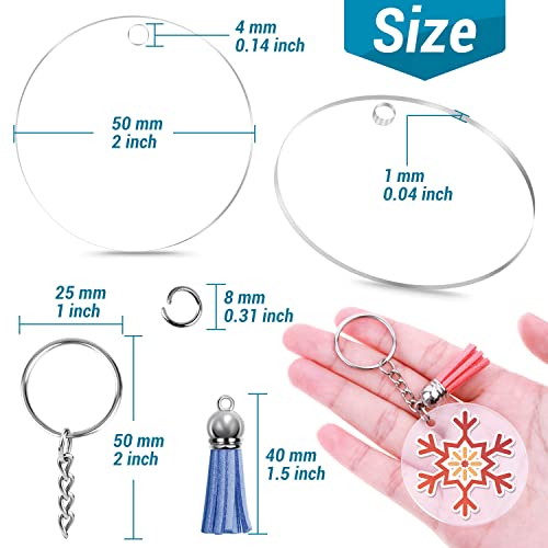 • 【350Pcs Acrylic Keychain Making Kit】The acrylic keychain blanks come with 60 pcs clear acrylic blanks, 60 pcs keychain tassels, 170 pcs jump rings, and 60 pieces of keychain rings. The acrylic keychain blank set is great for vinyl projects, DIY crafts, and keychain making. With this 2-inch acrylic keychain blanks DIY supplies, you can make a unique personalized keychain for your friends and your family