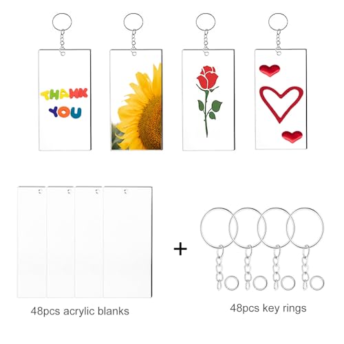 - 【Keychain DIY Kits】:You will get 48 pieces acrylic key chain blanks measuring approx. 3 x 7 cm/ 1.18 x 2.75 inches, 48 pieces key rings with chains, 48 pieces jump rings, enough to meet your vinyl projects, DIY crafts and keychains making.