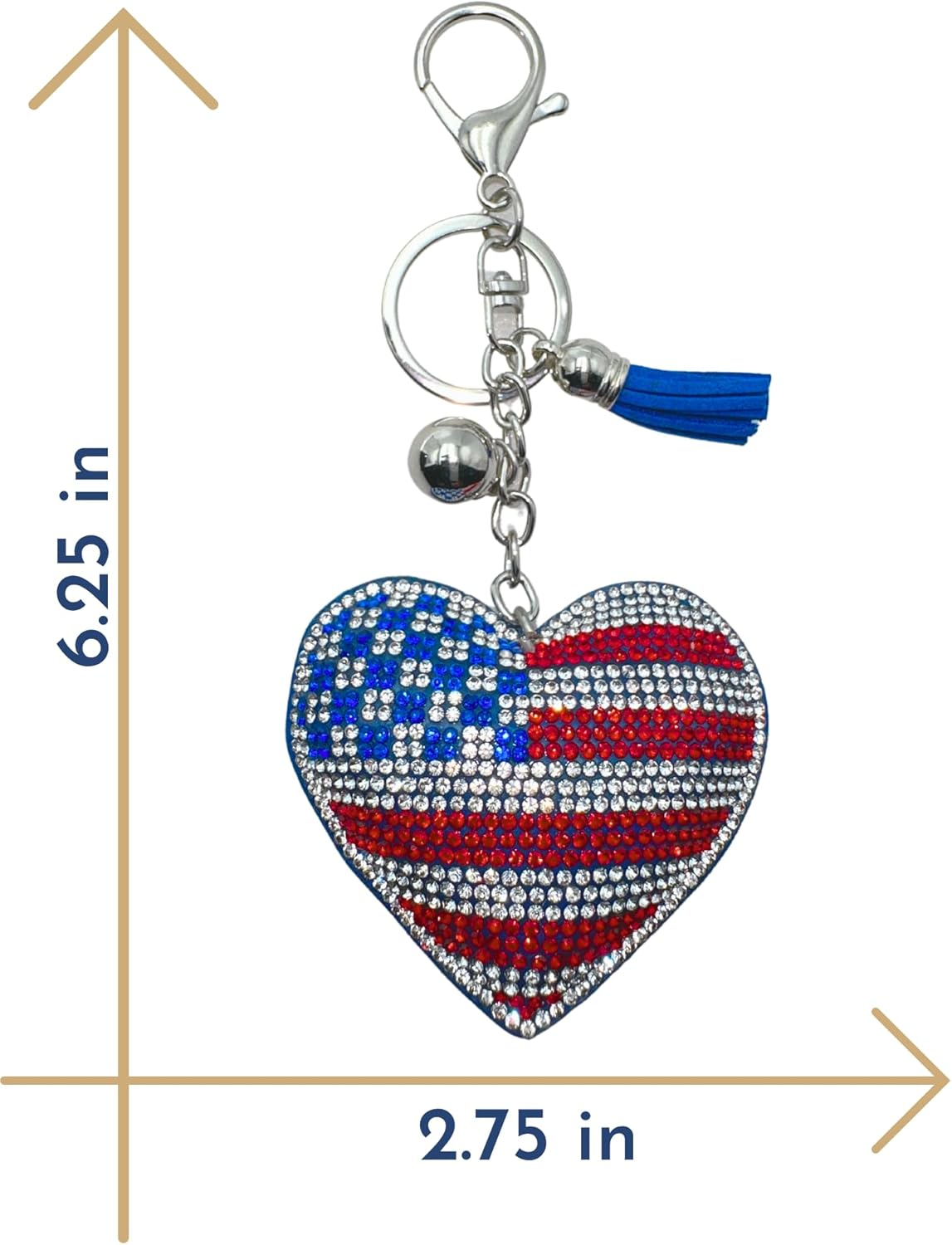 This visually striking American Flag heart keychain is the perfect accessory for your handbag. Made with a plush, puffy heart pendant adorned with inlaid rhinestones and a velvet back, it combines style and functionality. Easily clip it to your bag, tote, or backpack to keep your keys within reach.