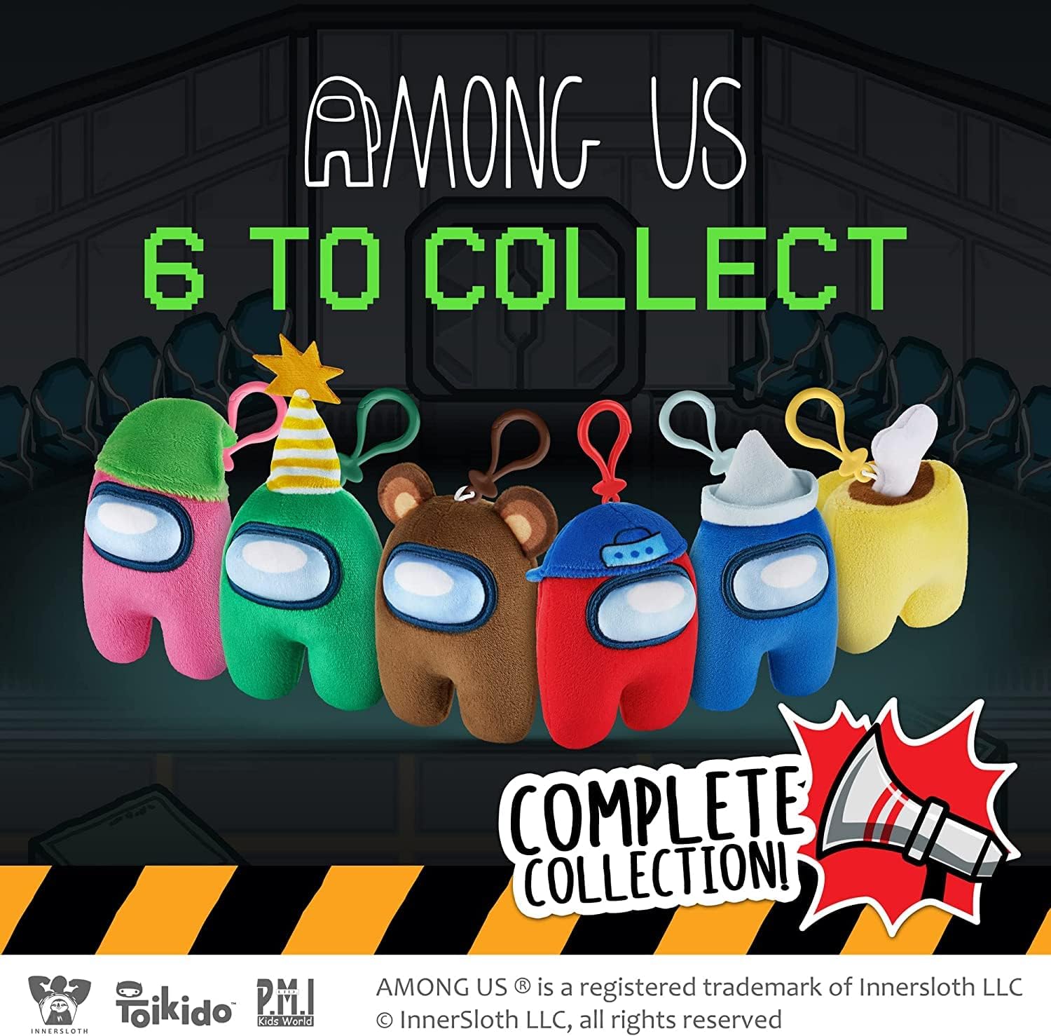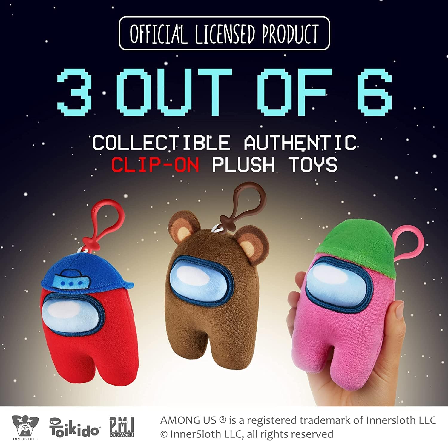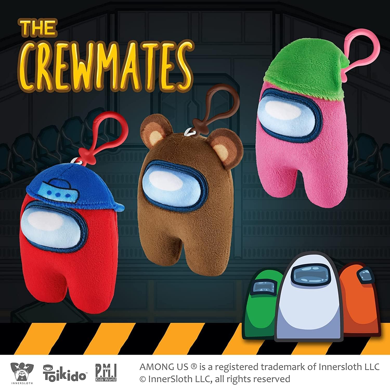 - Includes three mini plush crewmates in pink, red, and brown