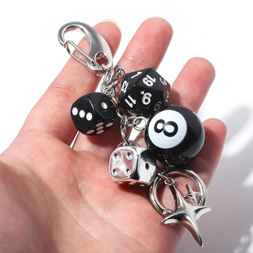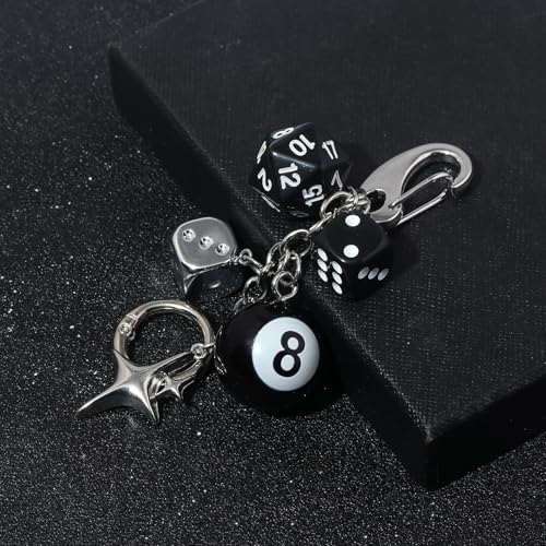 - 【Unique Y2K Dice Design】Features a black 8 ball, 20-sided D20 dice, classic dice, and a metallic star charm. Perfect for fans of billiards, tabletop games, or Y2K fashion. A bold, trendy accessory that stands out on any bag or key loop