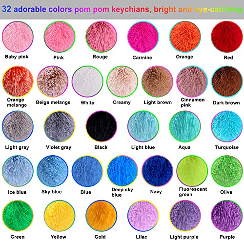 • Faux fur pom pom: the fluffy pom pom for keychain are in 32 different colors, bright as picture show, various of color pom pom balls help you match with different style accessories
