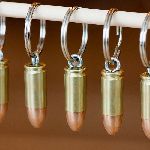 - Real (inert) 9mm Bullet with durable key ring