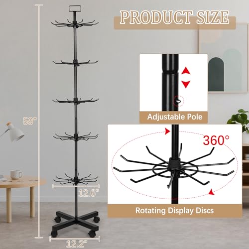 - Metal Five-Tier Merchandise Retail Display Stand: The spinner rack measures 59 inches tall, with 5.39 inches of hook length, 5-tier 50-hook rotating display rack. Space between each tier can be adjusted to fit the height of each item. You don't have to worry about storage space.