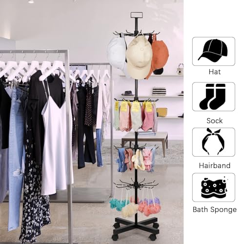 - Easy to move: The top of the store display rack has a card clip for hanging billboard, card, etc. Each tier of the retail display can be rotated for easy access to your items at any time. The bottom of the hat rack has 4 universal silent wheels including 2 brake wheels for free movement, allowing you to park it in the right place.