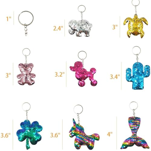 • MATERIALS AND SIZE: Girls' sequin keychain party favors are crafted with a fabric interior and adorned with reversible metal sequins. They are both durable and lightweight. Each cute keychain ranges in height from 2.4” to 4.2”, with a metal keyring diameter of 1”, making them the perfect size to stay intact on backpacks,purses or keyrings for long-lasting fun and utility.