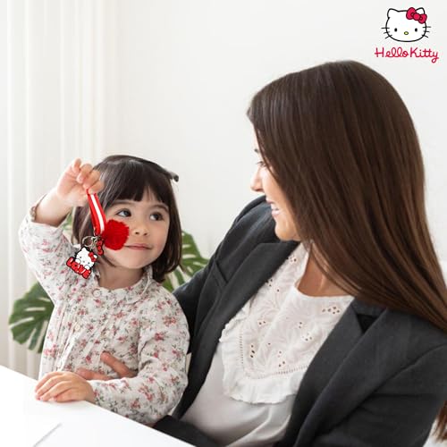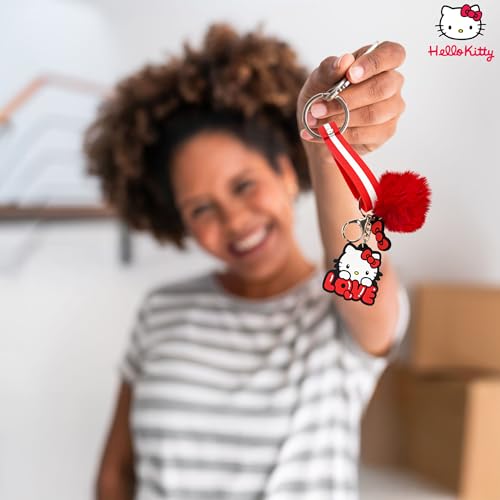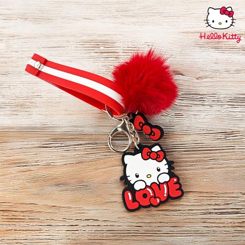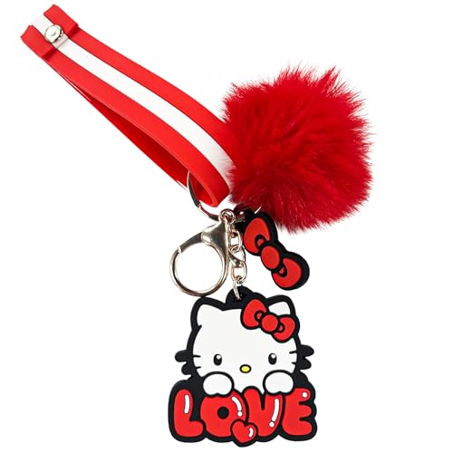 Hello Kitty Keychain | Hello Kitty Key Ring | Kawaii Pom Pom Fuzzy Key Chain | Kawaii Plush Lanyard Keychain | Sanrio Cat Figure Charm | Cute Sanrio Kitty Clip PomPom | Red | Officially Licensed