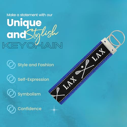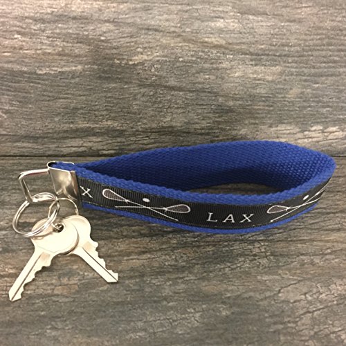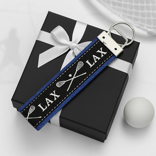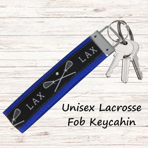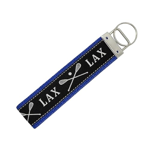 - Blue Lacrosse Wristlet: Stylish keychain with crossed stick graphics and “LAX” design in black and blue colors
