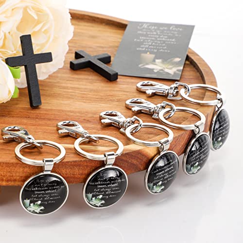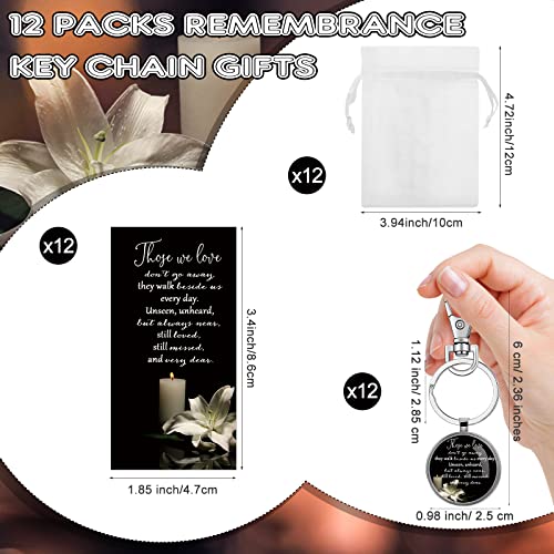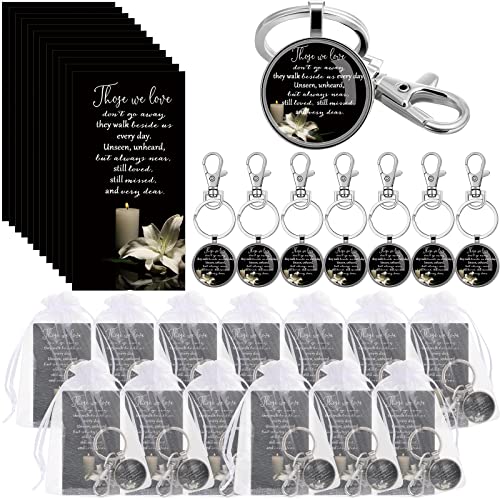 - Package Include: you will receive 12 sets of the funeral favors for guests, including 12 pieces of memorial keychains, 12 pieces of memorial cards and 12 pieces of white organza bags; This combination can be applied as consolation gifts at funerals, memorial services, Catholic festivals, celebration of life favors and so on