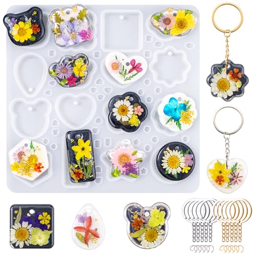 - 【Resin Mold Kit for Beginners】: This resin mold feature 16 different shape with 10pcs keychain rings & 10pcs jump rings (gold and silver); Each cavity has built-in holes to make keychains and pendants more easily without drilling, perfect for beginners to start the resin journey.