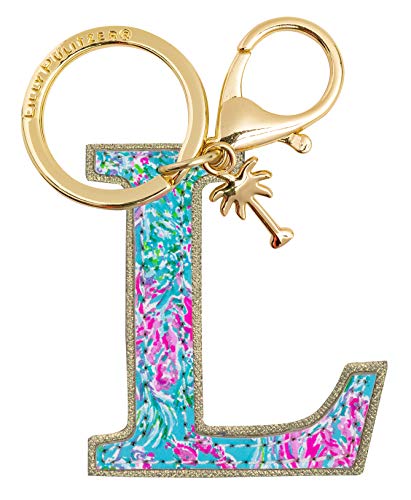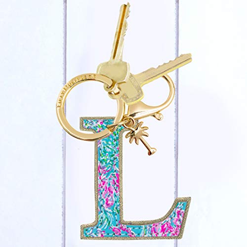 - "L" initial keychain is featured with a shimmering gold background and the bright Lilly pattern, Best Fishes, as an overlay to make gifting even more personal
