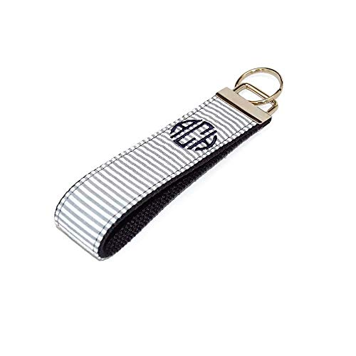 Monogrammed Gray Seersucker on Navy Keychain Key Fob