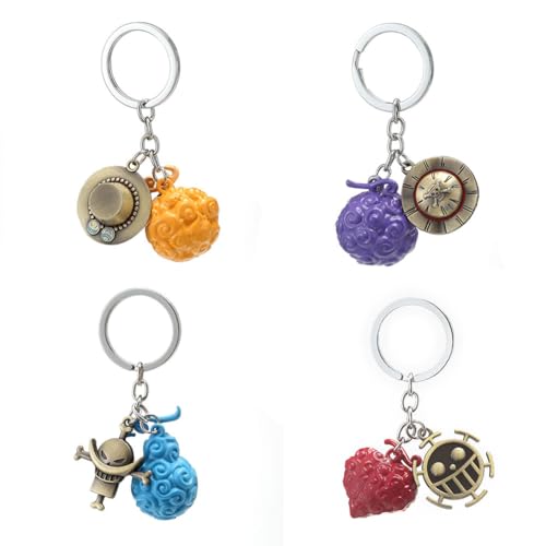 OVCOSER Devil Fruit Keychain 4pcs Set,Anime One Luffy Piece Trafalgar Law Ace Zoro Zinc Alloy Keyrings Pendants Gift Set (01 4pcs Devil fruit)