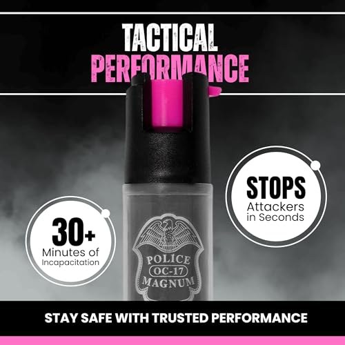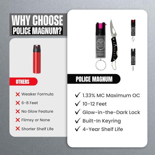 Police Magnum Mini Pepper Spray Self Defense- Small Discreet Pink OC Spray- 1 Pack 1/2oz Twist Lock Keyring (Black Pocket Knife & Clear Sleeve