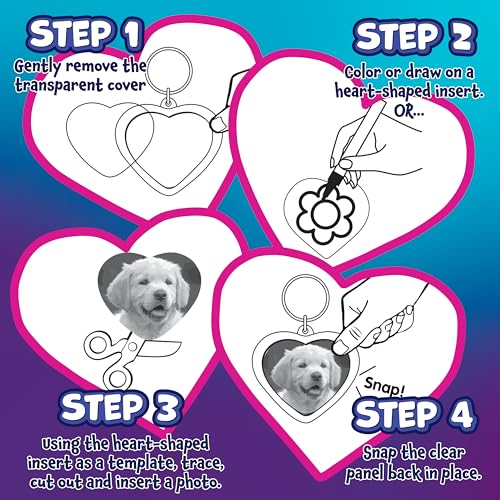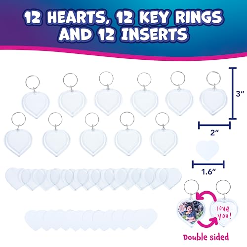 - CREATE 12 PERSONALIZED KEY RINGS — This set includes 12 heart-shaped acrylic key rings with snap-in covers. Personalize them with images, messages and drawings. Blank insert cards included.