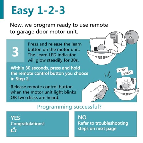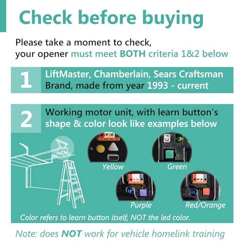 - Works for 1993-current LiftMaster, Chamberlain, Sears Craftsman brand openers with Purple, Red/Orange, Yellow and Green smart/learn button on the powerhead (motor unit attached to the garage ceiling – see all photos for clarification)