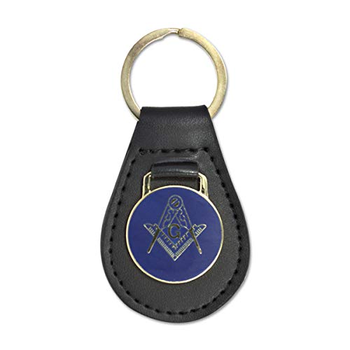 Square & Compass Black Leather Medallion Masonic Key Chain – [Blue & Gold][3 1/8” Tall]