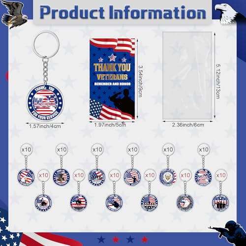 • Packaging Details: if you purchase our Veterans Day gift sets, you will receive 120 keychains, 120 custom cards and 120 transparent self adhesive bags; There are 12 keychain patterns, 10 each, and a variety of styles to meet your gift needs during Veterans Day; It is a ncie gift to express respect and commemorate veterans