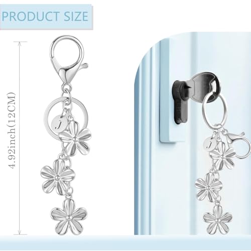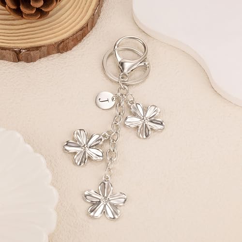 XGALBLA Silver Initial Keychain Silver Flower Charms for Key Cute Letter Keyring for Purse Handbag Backpack(J)