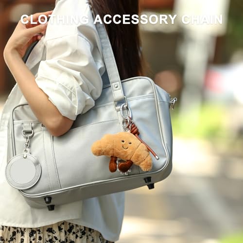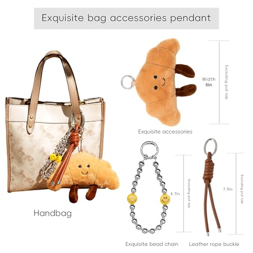 - 1 Adorable Croissant Plush Keychain Set This irresistibly cute croissant plush keychain features ultra-soft light brown plush fabric with a huggable cotton filling. The 5.9-inch charm boasts a realistic croissant shape with an embroidered smiling face, making it perfect as a women keychain or stylish backpack accessory.plush bag charms for handbags