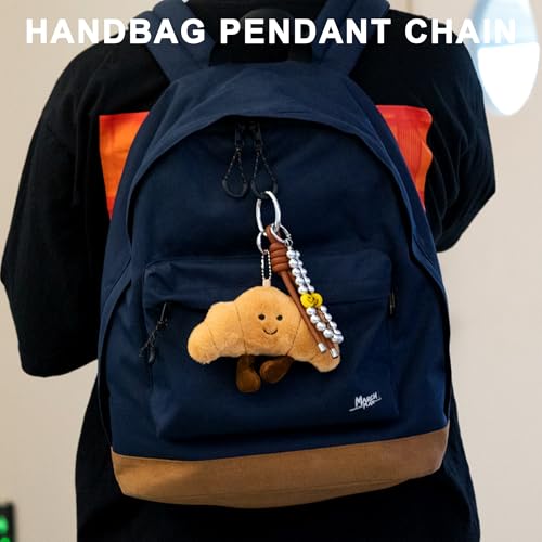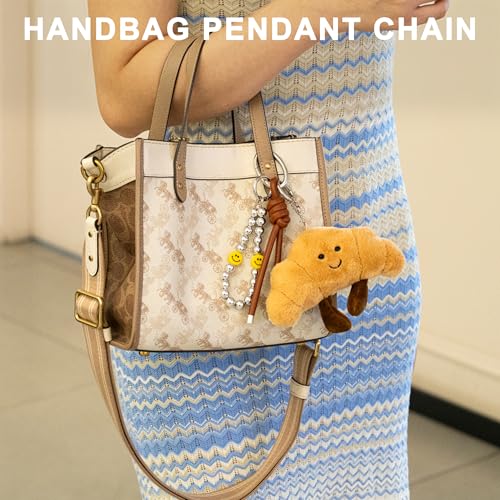 - 2 3-Piece Customizable Charm Collection Our versatile set includes: (1) plush croissant charm, (2) silver beaded wristlet, and (3) braided leather strap – all detachable! Mix and match these cute bag charms to create unique purse keychain for women combinations or use separately as wristlet keychain for women.